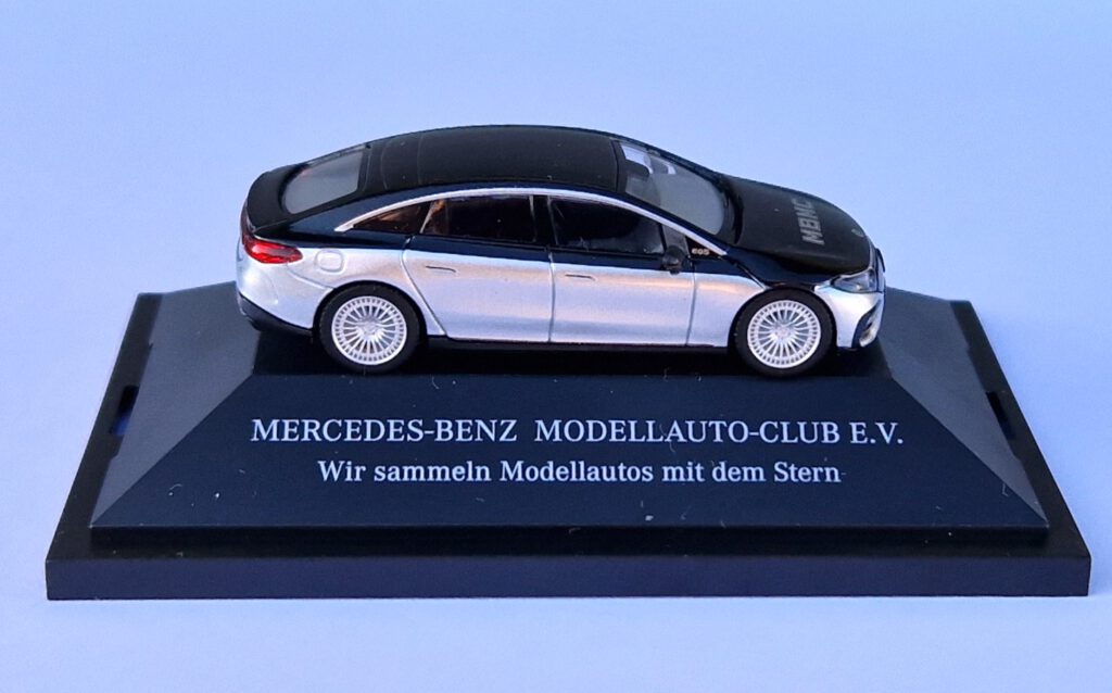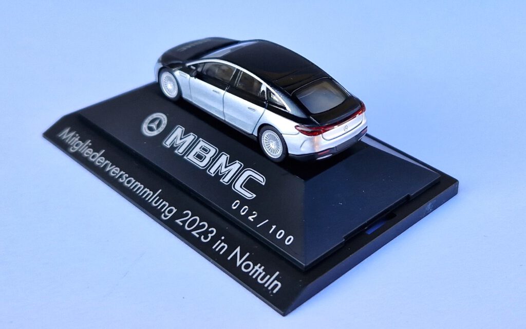 Ein echtes Highlight können die MBMC-Mitglieder zum Jahrestreffen 2023 in Nottuln erwerben. Der MBMC hat das Modell des EQS in einer aufwändigen Zweifarben-Lackierung produzieren lassen. Es ist auf Grund des hohen Aufwands absehbar, dass dies im Maßstab 1:87 das einzige Modell bleiben wird. Die Bedruckung von Modell und Sockel sowie die Durchnummerierung führt die langjährige Tradition der Club-Modelle aus Dietenhofen fort.